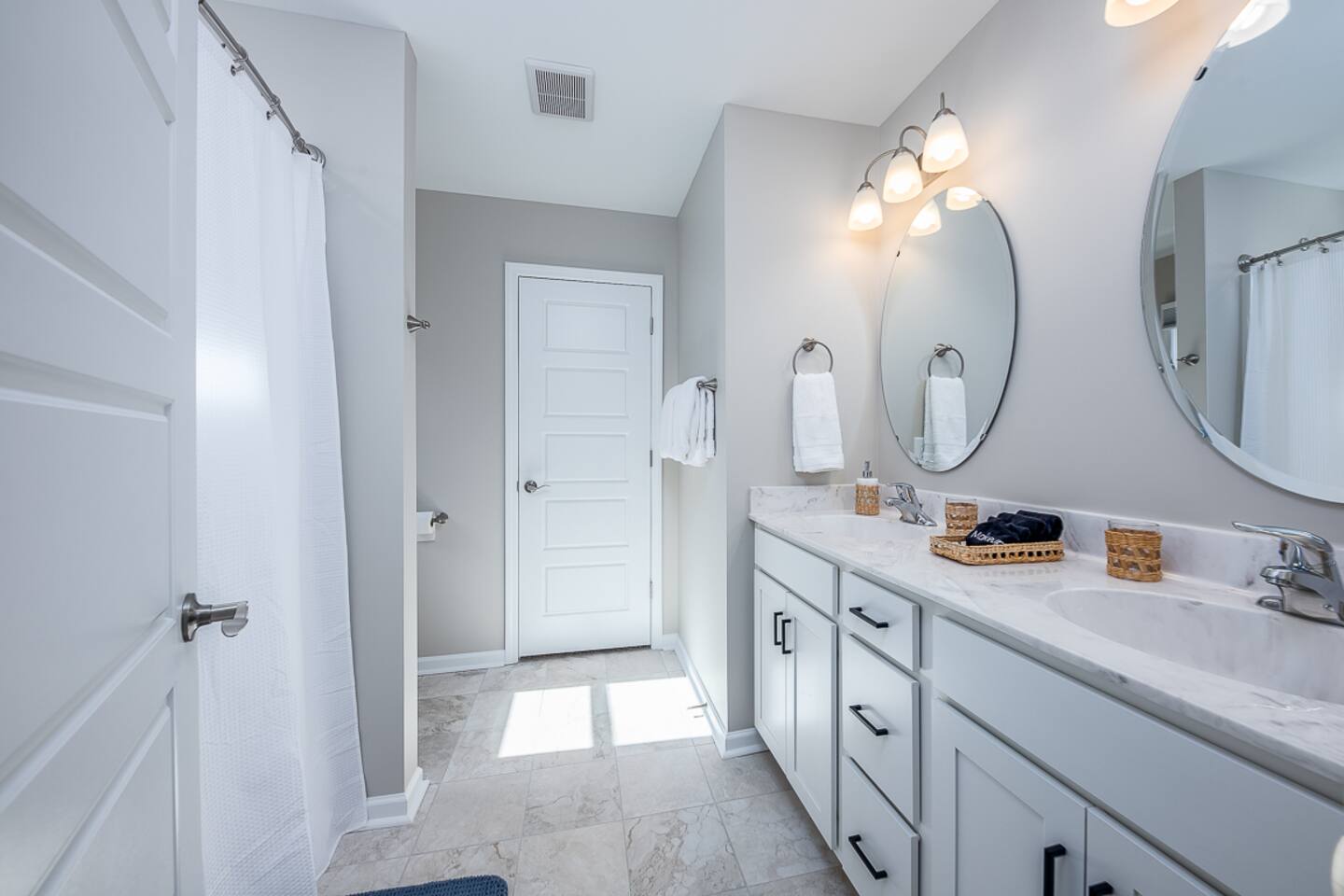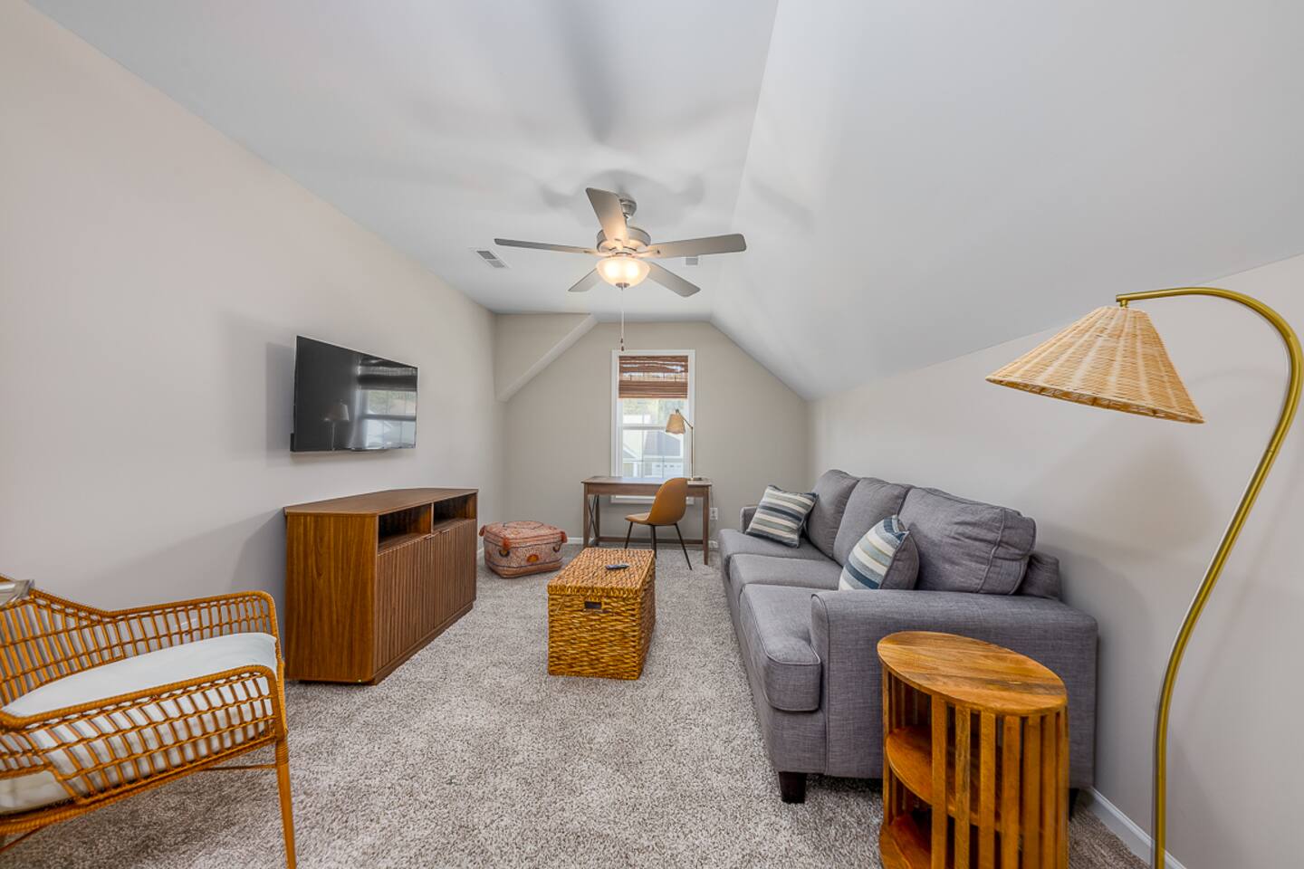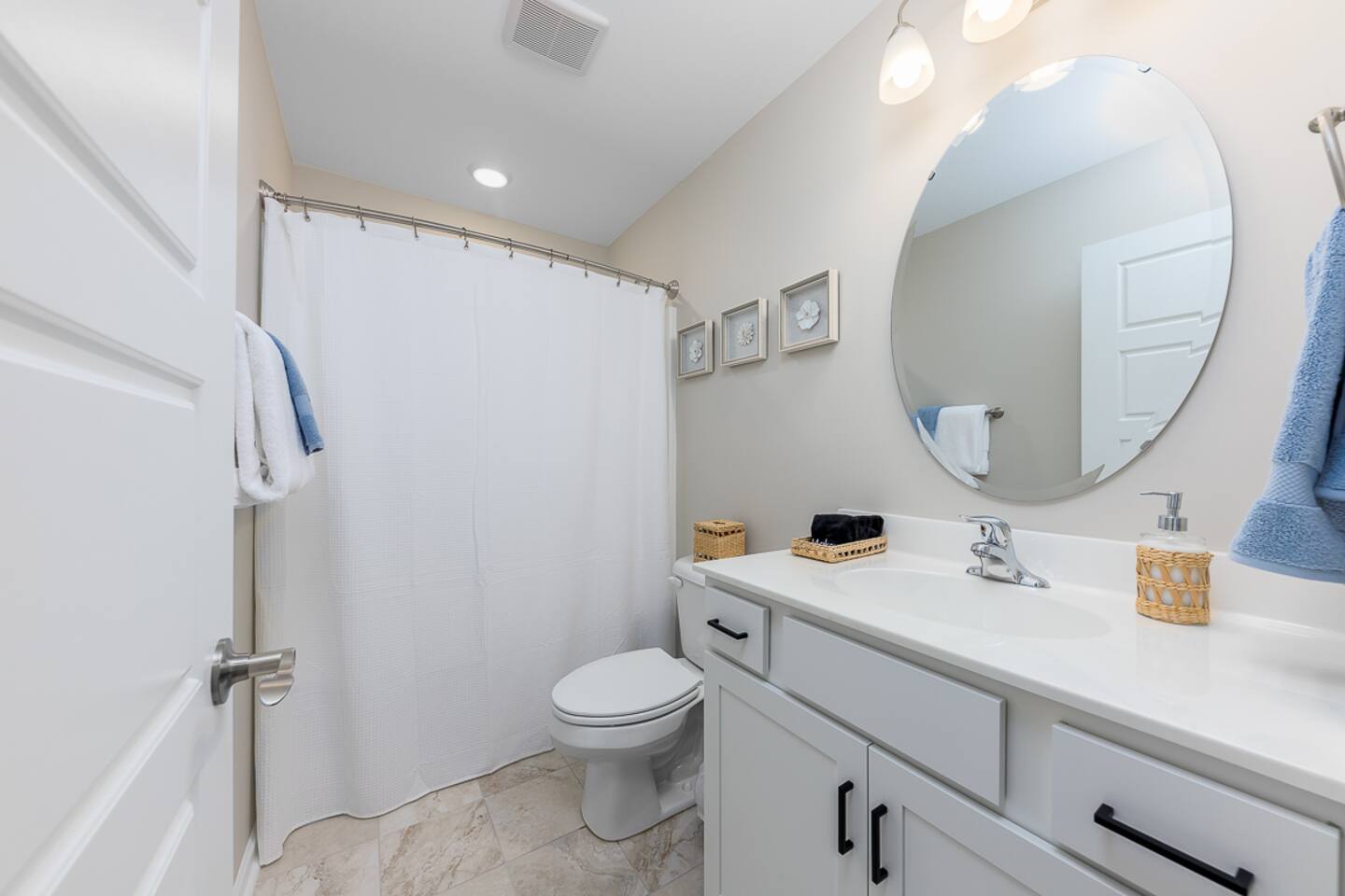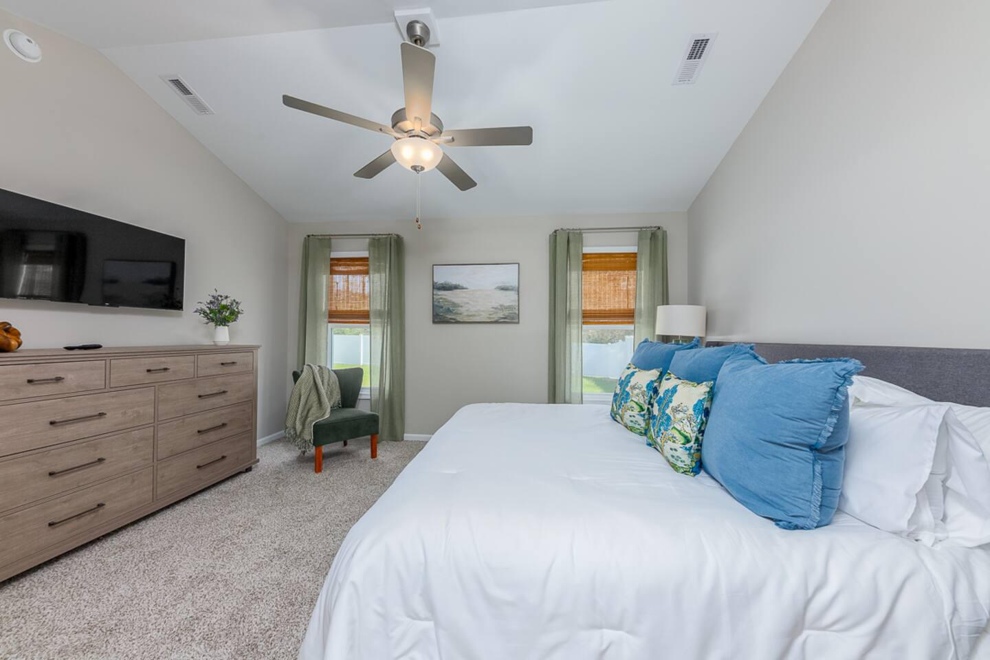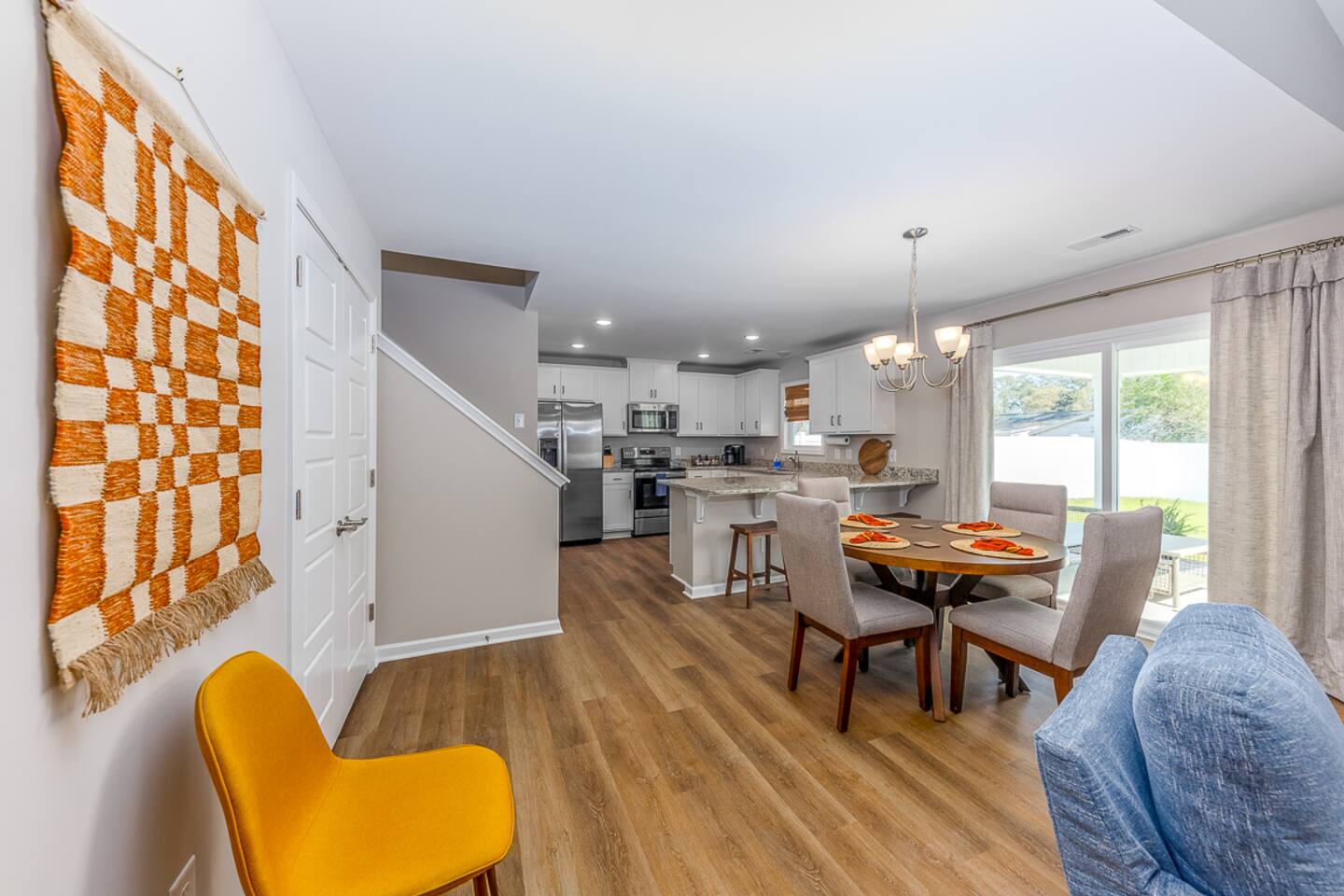 Key Features: ☀ Sleeps 8: 3 bedrooms, 1 king, 2 queens, 1 full pull-out couch ☀ 2 full bathrooms. Master bath with soaking tub ☀ Modern and well-equipped kitchen ☀ Amazing back porch fully fenced w/ comfortable furniture ☀ Gorgeous Living Room ☀ Plenty of linens and towels ☀ Pet Friendly w/ Fenced in Backyard ☆☆ BEDROOMS ☆☆ This gorgeous home accommodates 8 guests in 3 bedrooms and a full-sized pull-out couch. The master bedroom is on the main level of the home and is fitted with a king-size bed and a full ensuite Master bathroom. The bonus room over the garage has a full-sized pull-out couch with a working area and a Roku TV The 2 Queen rooms are on the main level and have plenty of space for storage Another full bathroom with a shower-tub combo to be shared by the 2 queen rooms ☆☆ BATHROOMS ☆☆ There are two full bathrooms in this home, each of them stocked with all the essentials you need for the duration of your stay. The master bedroom on the main floor contains an ensuite full bathroom with a walk-in shower and a double vanity mirror. The second bathroom is a jack-and-jill style with a shower/tub combo. Worry about nothing with these thoughtfully stocked bathrooms that provide everything you need and more. ☆☆ KITCHEN & LOUNGE ☆☆ The bright and airy kitchen is fully equipped with all the appliances, utensils, and cookware you need to feel at home. This thoughtfully designed home provides a scullery area in addition to a separate laundry area. The dining area seats 5 with 3 additional seating at the island bar. The first lounge is situated on the main level of the home and is kitted with an HDTV with a Roku entertainment system, allowing full access to your favorite streaming services. ☆☆ OUTSIDE SPACE ☆☆ Enjoy the porch out back with a book, lounging comfortably with your furry friend! We also have a car garage you are welcome to use ★☆ Book Today & Let Us Take Care Of You In New Bern ☆★