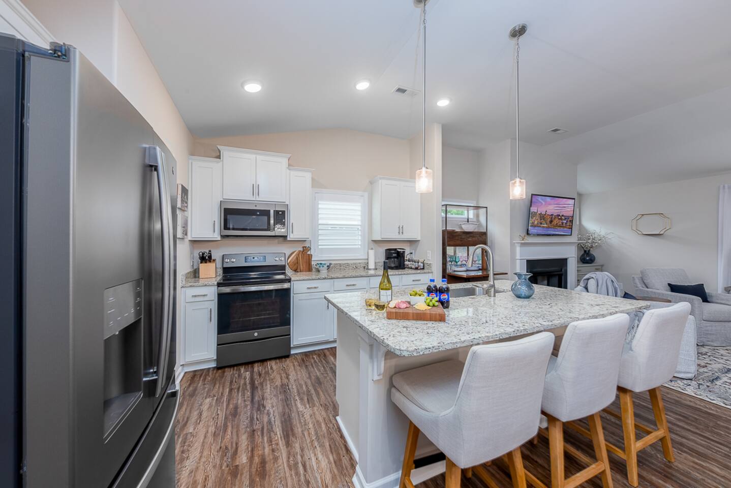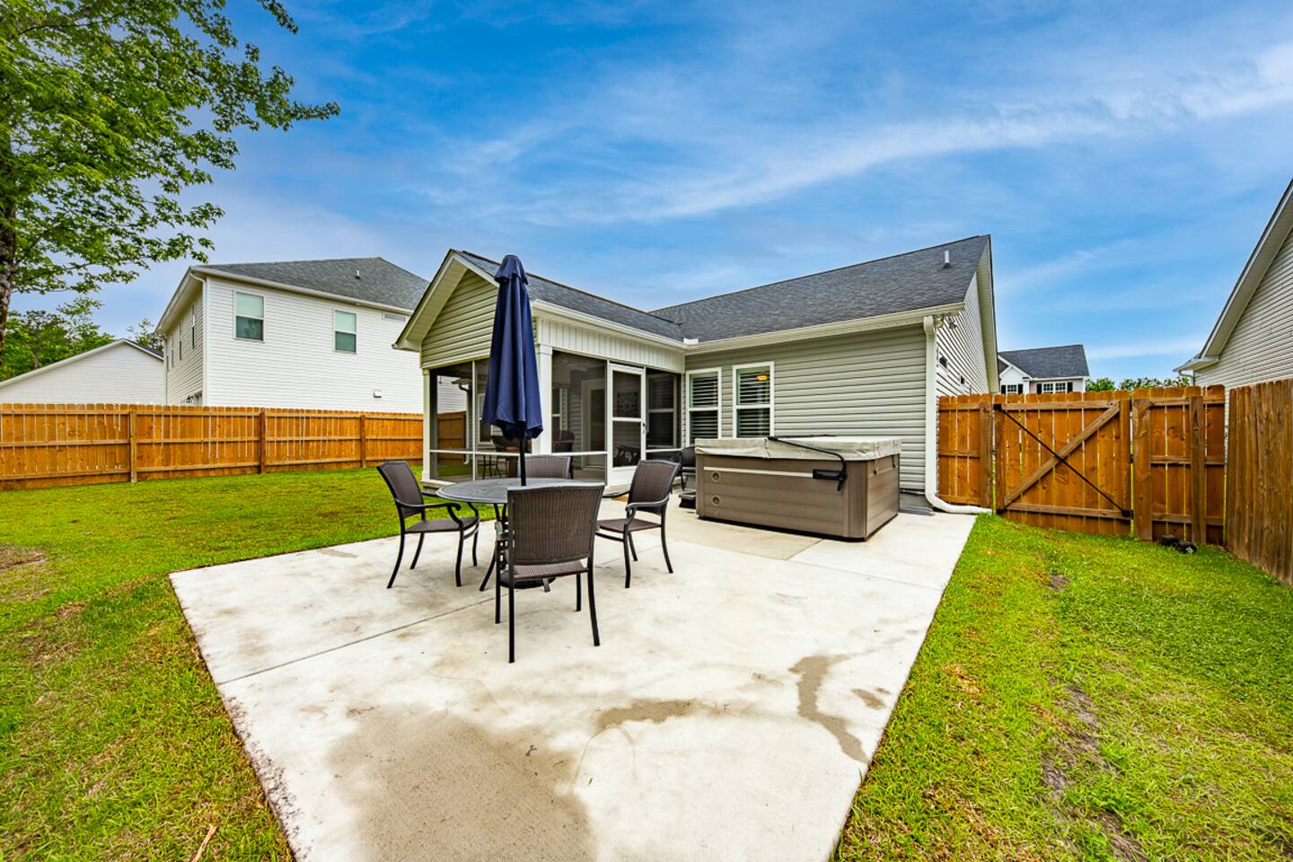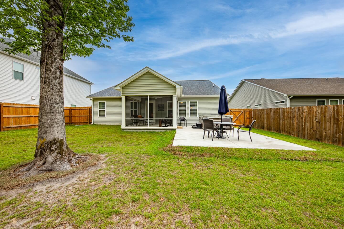 Key Features: ☀ Sleeps 6: 3 bedrooms, 1 king, 1 queen, 2 single beds ☀ 2 full bathrooms. Master bath has double vanity ☀ Hot tub, screened in porch, and fenced in backyard! ☀ Modern and well-equipped kitchen ☀ Amazing back porch fully fenced w/ comfortable furniture ☀ Gorgeous Living Room ☀ Plenty of linens and towels ☀ Pet Friendly ☆☆ BEDROOMS ☆☆ This gorgeous home accommodates 6 guests in 3 bedrooms. The master bedroom is fitted with a king-size bed and a full ensuite Master bathroom. A Queen room fitted with a queen-size bed and plenty of space for storage and a room with 2 single beds. Another full bathroom with a shower-tub combo is to be shared by the 2 rooms ☆☆ BATHROOMS ☆☆ There are two full bathrooms in this home, each of them stocked with all the essentials you need for the duration of your stay. The master bedroom contains an ensuite full bathroom with a walk-in shower and a double vanity mirror. The second bathroom has a shower/tub combo. Worry about nothing with these thoughtfully stocked bathrooms that provide everything you need and more. ☆☆ KITCHEN & LOUNGE ☆☆ The bright and airy kitchen is fully equipped with all the appliances, utensils, and cookware you need to feel at home. This thoughtfully designed home provides a scullery area in addition to a separate laundry area. The dining area seats 6 with 3 additional seating at the island bar. The lounge is kitted with an HDTV with a Roku entertainment system, allowing full access to your favorite streaming services. ☆☆ OUTSIDE SPACE ☆☆ Enjoy the porch out back with a book, lounging comfortably with your furry friend! We also have a car garage you are welcome to use ★☆ Book Today & Let Us Take Care Of You In New Bern ☆★