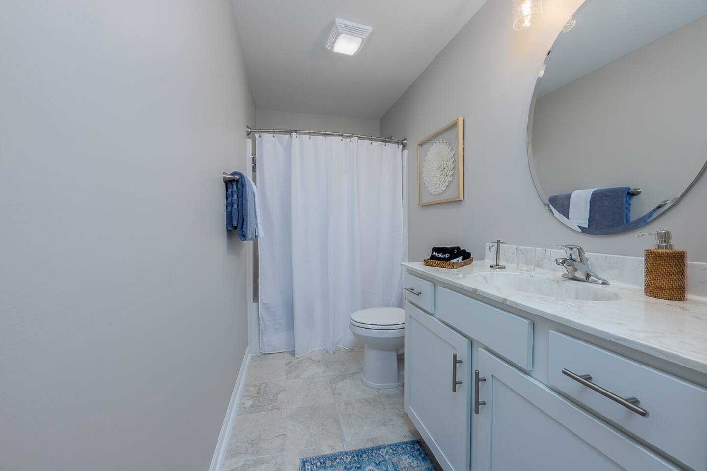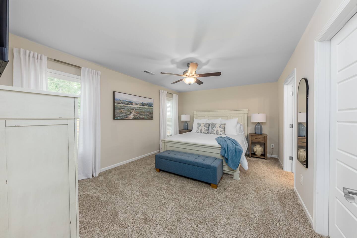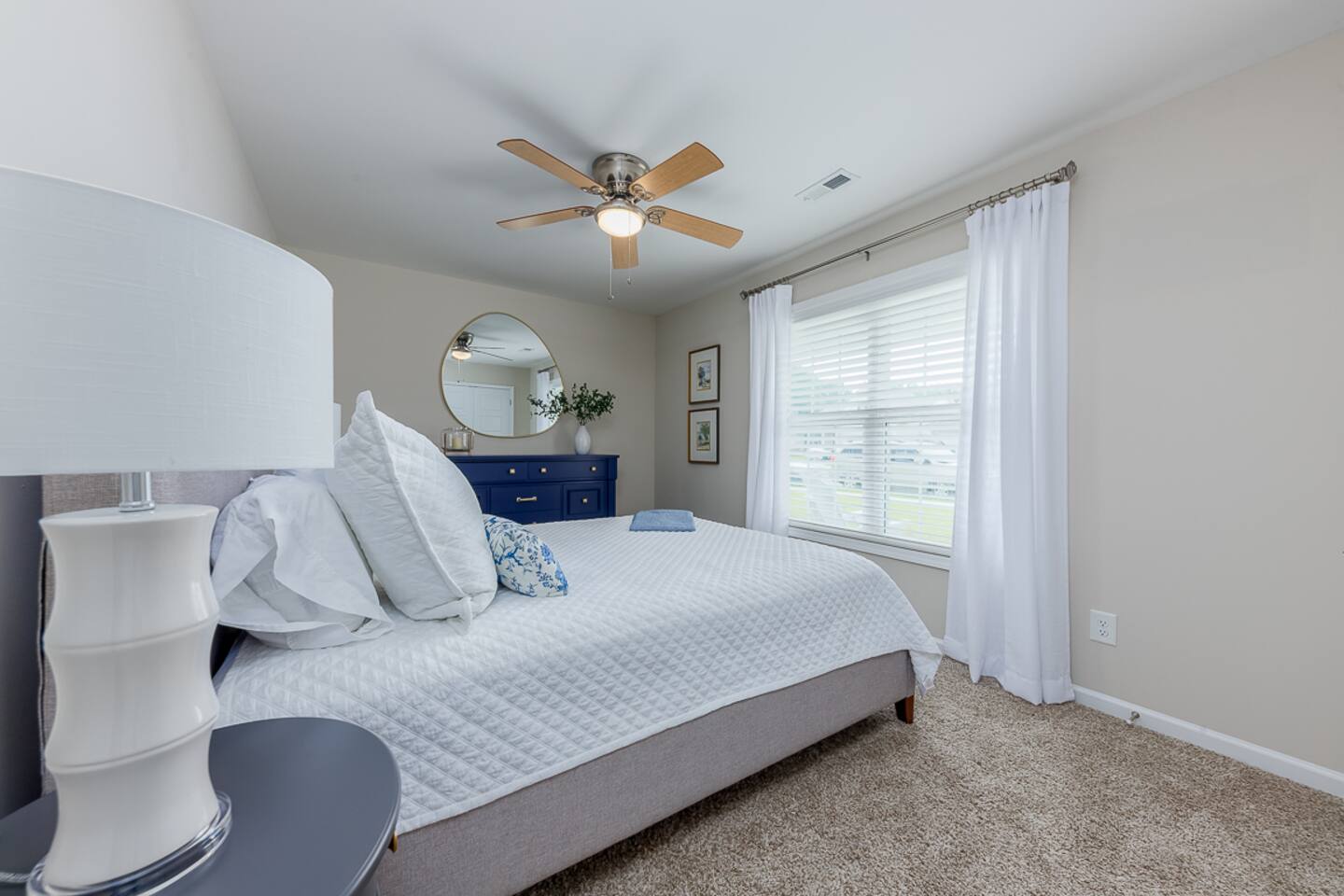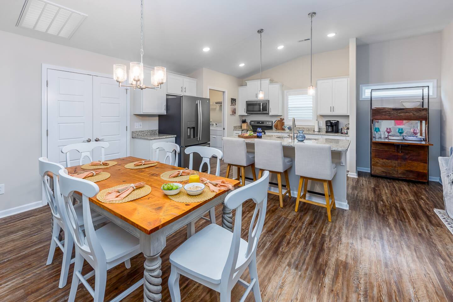 Key Features: ☀ Sleeps 6: 3 bedrooms, 1 king, 1 queen, 2 single beds ☀ 2 full bathrooms. Master bath has double vanity ☀ Hot tub, screened in porch, and fenced in backyard! ☀ Modern and well-equipped kitchen ☀ Amazing back porch fully fenced w/ comfortable furniture ☀ Gorgeous Living Room ☀ Plenty of linens and towels ☀ Pet Friendly ☆☆ BEDROOMS ☆☆ This gorgeous home accommodates 6 guests in 3 bedrooms. The master bedroom is fitted with a king-size bed and a full ensuite Master bathroom. A Queen room fitted with a queen-size bed and plenty of space for storage and a room with 2 single beds. Another full bathroom with a shower-tub combo is to be shared by the 2 rooms ☆☆ BATHROOMS ☆☆ There are two full bathrooms in this home, each of them stocked with all the essentials you need for the duration of your stay. The master bedroom contains an ensuite full bathroom with a walk-in shower and a double vanity mirror. The second bathroom has a shower/tub combo. Worry about nothing with these thoughtfully stocked bathrooms that provide everything you need and more. ☆☆ KITCHEN & LOUNGE ☆☆ The bright and airy kitchen is fully equipped with all the appliances, utensils, and cookware you need to feel at home. This thoughtfully designed home provides a scullery area in addition to a separate laundry area. The dining area seats 6 with 3 additional seating at the island bar. The lounge is kitted with an HDTV with a Roku entertainment system, allowing full access to your favorite streaming services. ☆☆ OUTSIDE SPACE ☆☆ Enjoy the porch out back with a book, lounging comfortably with your furry friend! We also have a car garage you are welcome to use ★☆ Book Today & Let Us Take Care Of You In New Bern ☆★